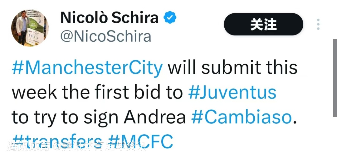 斯基拉发文表示,曼城本周将向尤文图斯递交第一份报价,目标是签下坎比亚索。本赛季,坎比亚索在尤文图斯的两个边路位置都有出场记录。这位24岁的球员一直是曼城关注的对象,并被视为球队重建过程中潜在的引援目标之一。