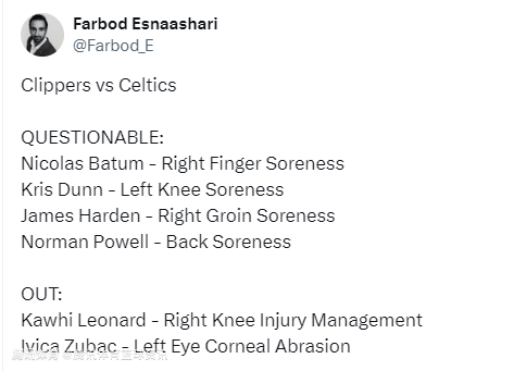 快船官宣小卡祖巴茨缺战凯尔特人 哈登鲍威尔出战成疑