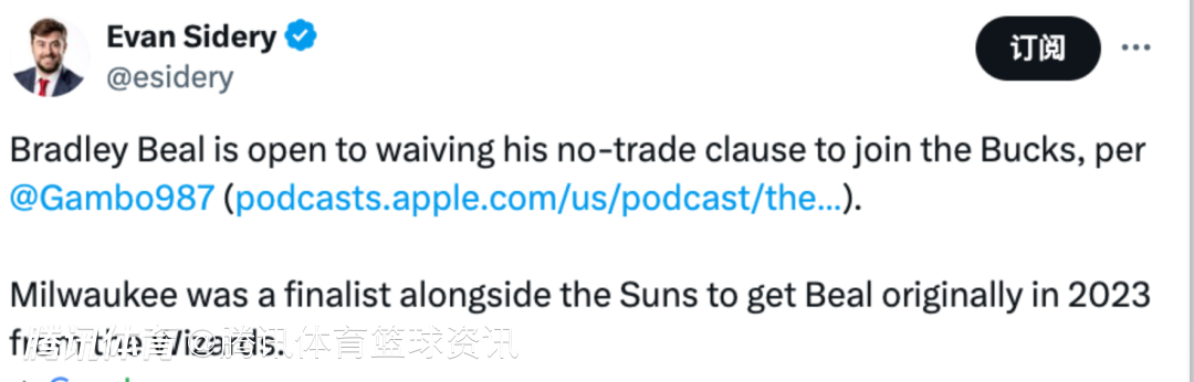 2025-01-22 09:50北京时间1月22日,据名记Evan Sidery报道,比尔愿意放弃自己的交易否决权加盟雄鹿,早在22-23赛季比尔还在奇才的时候,当时雄鹿就曾对其有意,和太阳一同争夺过这位全明星后卫,不过在23年休赛期,太阳在和奇才、步行者的一笔三方交易案中得到了比尔。