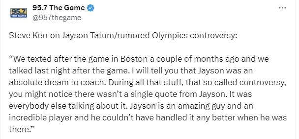值得一提的是,科尔还谈到了塔图姆,他说道:“几个月前在波士顿的比赛结束后,我们发了短信,昨晚比赛结束后我们又聊了聊。我会告诉你,塔图姆绝对是教练员梦寐以求的球员。在所有这些所谓的争议中,你可能会注意到,没有一句话是来自塔图姆的,都是其他人在谈论。 塔图姆是个了不起的人,也是个了不起的球员,他对此事的处理得再好不过了。”