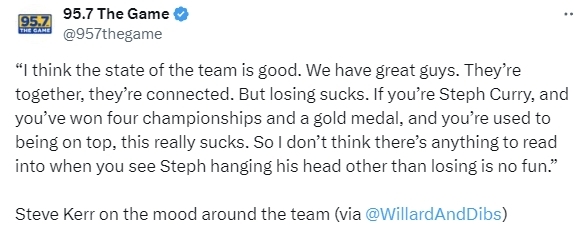 科尔表示:“我觉得球队很努力,但缺乏信心,所以这不是关于努力的问题。我们的球员打得很努力,他们只是有点不开心。球队目前状态还好,我们有很棒的球员。他们团结在一起,互相联系。但输球很糟糕。如果你是斯蒂芬-库里,你赢得过四次总冠军和一枚金牌,你习惯了高高在上,这真的很糟糕。所以我认为,当你看到库里垂头丧气时,除了输球不开心之外,没有其他任何东西可以解读。”