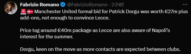 罗马诺:曼联向莱切正式报价多尔古 2700万欧+浮动条款