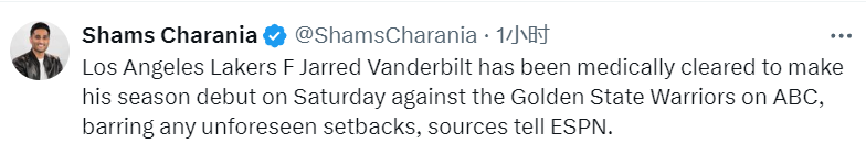 消息人士透露,除非出现不可预见的伤情反复,湖人前锋范德比尔特将在周日对阵勇士队的比赛复出,迎来赛季首秀,他已获得医疗许可。
