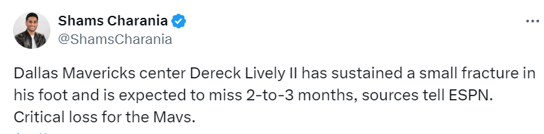 独行侠首发中锋莱夫利遭遇右脚轻微骨折,预计将缺席2-3个月。消息人士称,莱夫利缺席了过去三场比赛,今日主场对阵森林狼的比赛曾被列为出战成疑,但进一步的检查发现他有轻微骨折。