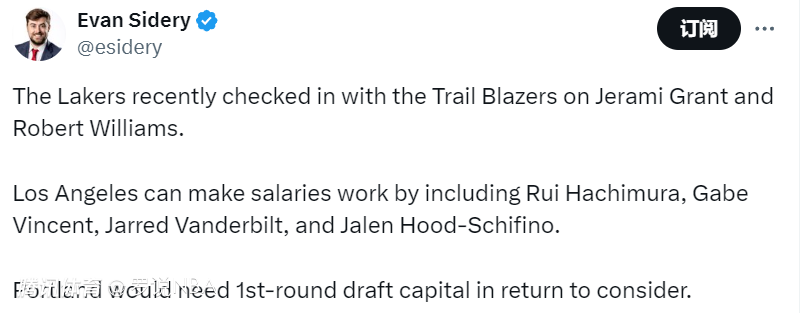 2025-01-23 05:10北京时间1月23日,据名记Evan Sidery报道,湖人队最近与开拓者谈判了杰拉米-格兰特和罗伯特-威廉姆斯的交易。湖人可以通过打包八村垒、文森特、范德比尔特和胡德-席菲诺来配平薪水。开拓者需要对方提供首轮签作为回报。