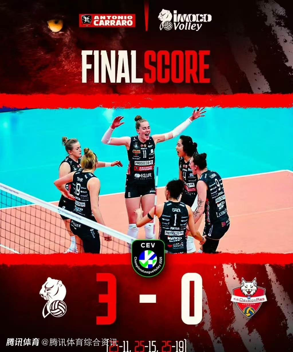 2025-01-23 08:30北京时间1月23日,在2024-2025赛季欧洲女排冠军联赛小组赛第四轮第6轮比赛中,A组的意大利科内利亚诺女排主场以3-0战胜波兰热舒夫,取得六连胜,以18分锁定小组第一,直接晋级八强。三局比分分别为25-11、25-15和25-19。