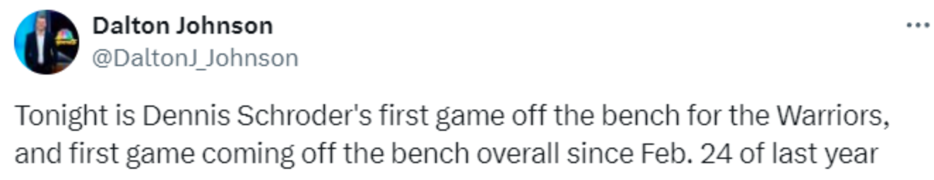 本场比赛施罗德并不在球队的首发阵容,这也是他加盟勇士后首次从板凳席上出发,同时也是自去年2月25日再度出任替补。2024年2月25日篮网客场不敌森林狼的比赛中,当时还在篮网效力的施罗德替补出战28分钟,拿到9分1篮板2助攻,从那之后他一直都是出任首发。