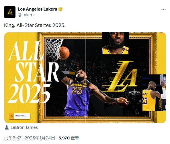 湖人队官方发来贺电:国王,2025年全明星首发!