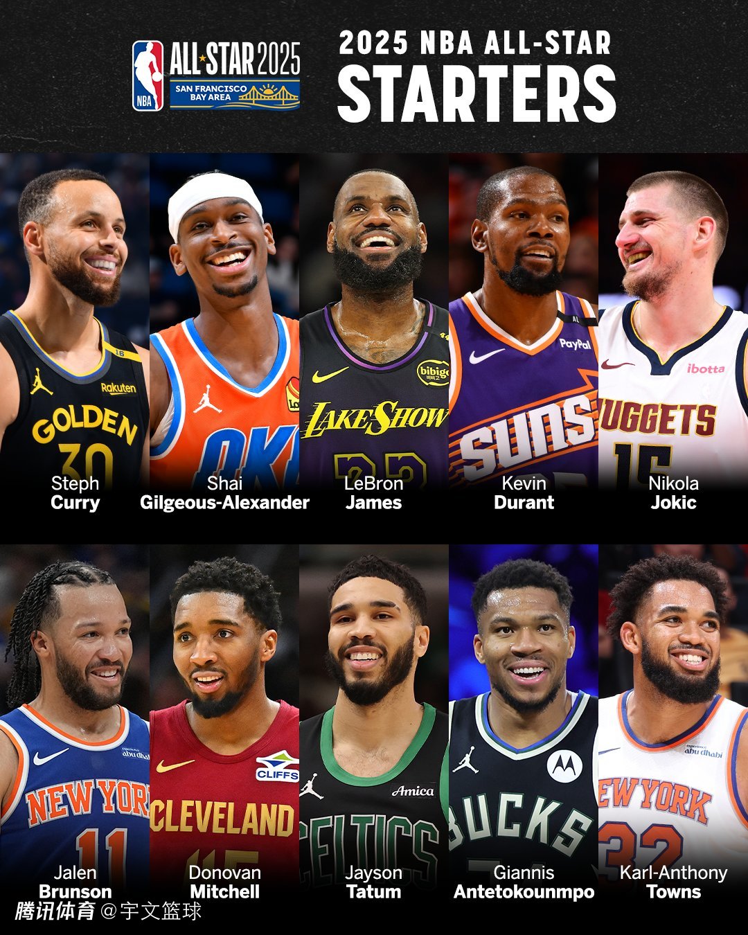 2025-01-24 10:50北京时间1月24日,NBA官方公布了2025年全明星首发阵容名单,东部首发是字母哥、塔图姆、唐斯、米切尔、布伦森,西部首发是约基奇、詹姆斯、杜兰特、亚历山大、库里,其中字母哥和约基奇各自领跑东西部。下面给大家带来本次全明星首发阵容的详细解读。