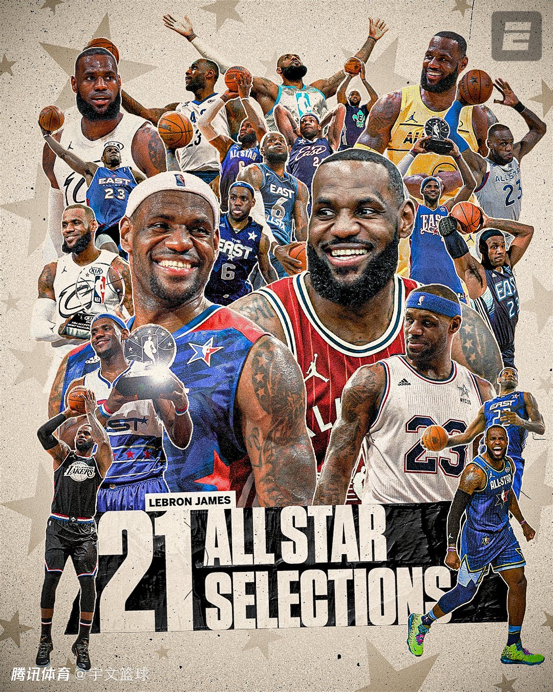 詹姆斯职业生涯连续第21次入选全明星首发,除新秀赛季以外从不缺席。他在去年超越贾巴尔成为进入全明星最多的球星,本赛季他继续刷新这项纪录,历史最长的河仍然不断蔓延。与此同时,他也是历史上首位40岁入选全明星首发球员。