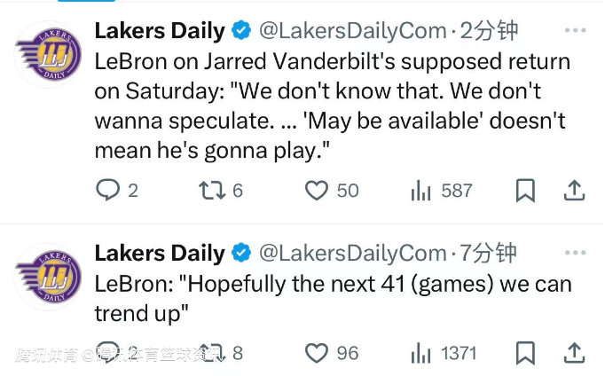 詹姆斯:希望剩余比赛能够继续保持上升趋势 不知道范德比尔特何时复出