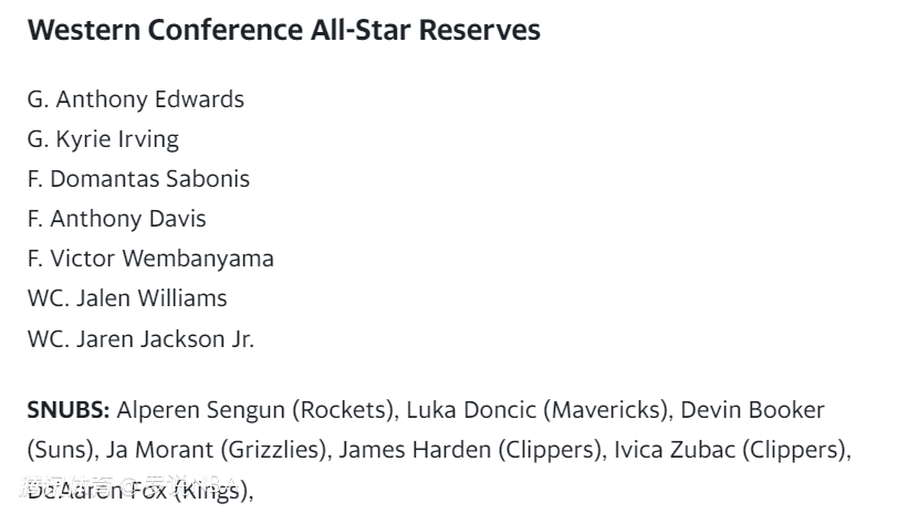雅虎体育预测的西部7人替补是爱德华兹、欧文、萨博尼斯、浓眉、文班亚马、杰伦-威廉姆斯、小贾伦-杰克逊。这意味着他们认为申京、东契奇、布克、莫兰特、哈登、祖巴茨、福克斯等人可能无缘全明星。解析如下——