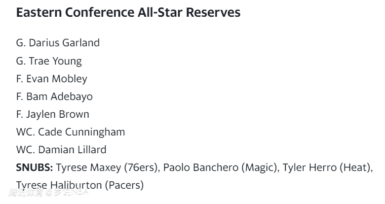 雅虎体育预测的东部7人替补是加兰、特雷-杨、莫布利、阿德巴约、杰伦-布朗、坎宁安和利拉德。这意味着他们认为马克西、班凯罗、希罗和哈利伯顿等球员可能无缘全明星。解析如下——