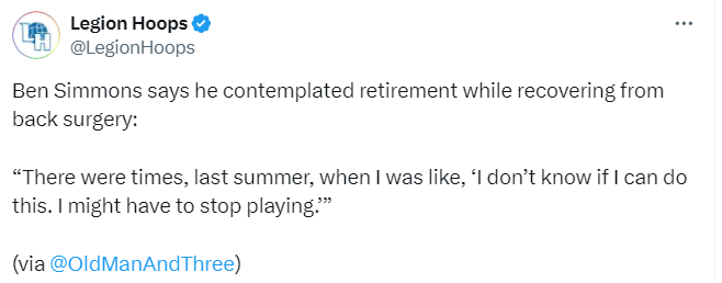 那次手术解决的是西蒙斯下背部神经受压的问题,这是他三年内第二次接受背部手术。“去年夏天,有几次我都觉得,‘我不知道我是否能做到。我可能不得不停止打球了,’”西蒙斯在播客节目中说道。