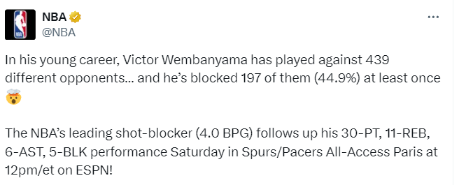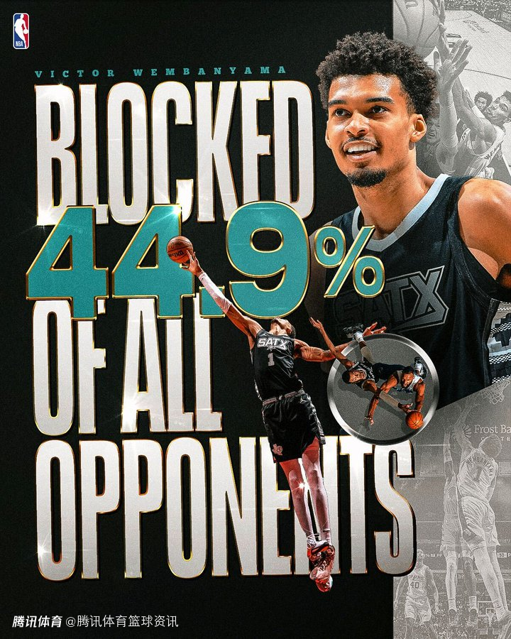 文班亚马已与439人交手过 其中197人被他送出过盖帽