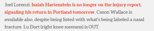 2025-01-26 06:20北京时间1月26日,据雷霆队记Joel Lorenzi透露的消息显示,球队中锋哈尔滕施泰因已不在伤病报告中,这表明他将在明天对阵开拓者的比赛中复出。华莱士也可以出战,尽管他被列在伤病名单上,标注为鼻骨骨折。多尔特因右膝疼痛将缺席比赛。