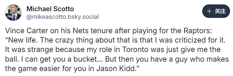 卡特还谈到自己从猛龙交易至篮网的经历,他说道:“这是全新的开始。奇怪的是,我却因此受到了批评。因为在多伦多,我的角色就是‘把球给我,我能帮你得分’。但后来有了基德,他让比赛变得更容易了。”