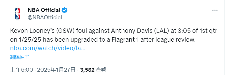 2025-01-27 06:40北京时间1月27日,NBA官方宣布,升级卢尼在湖勇二番战上对浓眉的一次犯规。这次犯规被升级为一级恶意犯规。