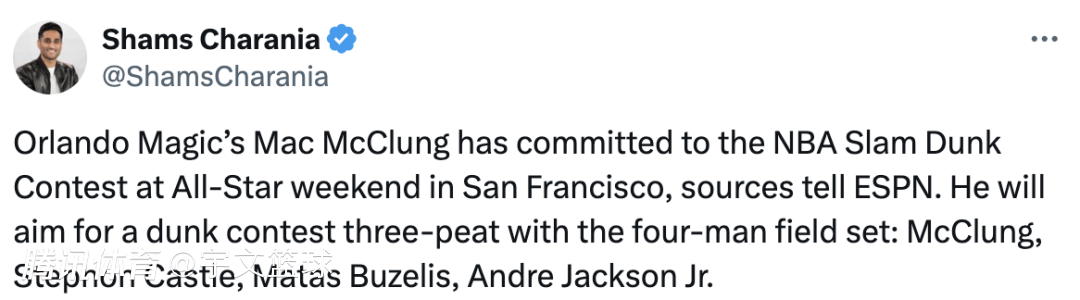 2025-01-28 07:30北京时间1月28日,据名记Shams报道,两届扣篮大赛冠军麦克朗承诺出战今年在旧金山举办的全明星周末扣篮大赛,他将力争实现扣篮大赛史无前例的三连冠。自此,25年全明星扣篮大赛的四人名单正式确定,另外三人分别是马刺新秀斯蒂芬-卡斯尔,公牛新秀马塔斯-布泽利斯,雄鹿的二年级球员小安德烈-杰克逊。