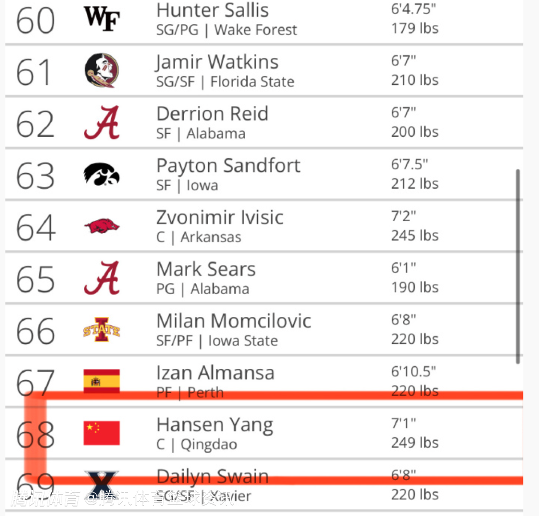 2025-01-28 14:30北京时间1月28日,知名模拟选秀网站Tankathon更新了25年NBA模拟选秀排名,杨瀚森排名相较上一期上升一位,来到第68位。