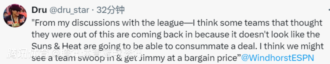 据悉,在过去48小时里,热火现在对于巴特勒的要价已经降低,现在他们会比一个月前更努力要送走他,球队想要尽快结束这场闹剧。现在联盟只有一支球队很想要得到巴特勒(巴特勒也想去),但因为比尔被视为NBA中最难交易的合同(拥有交易否决权),太阳交易比尔的可能性越来越小,而之前被认为可能无法得到巴特勒的球队现在也有可能会达成这笔交易案。