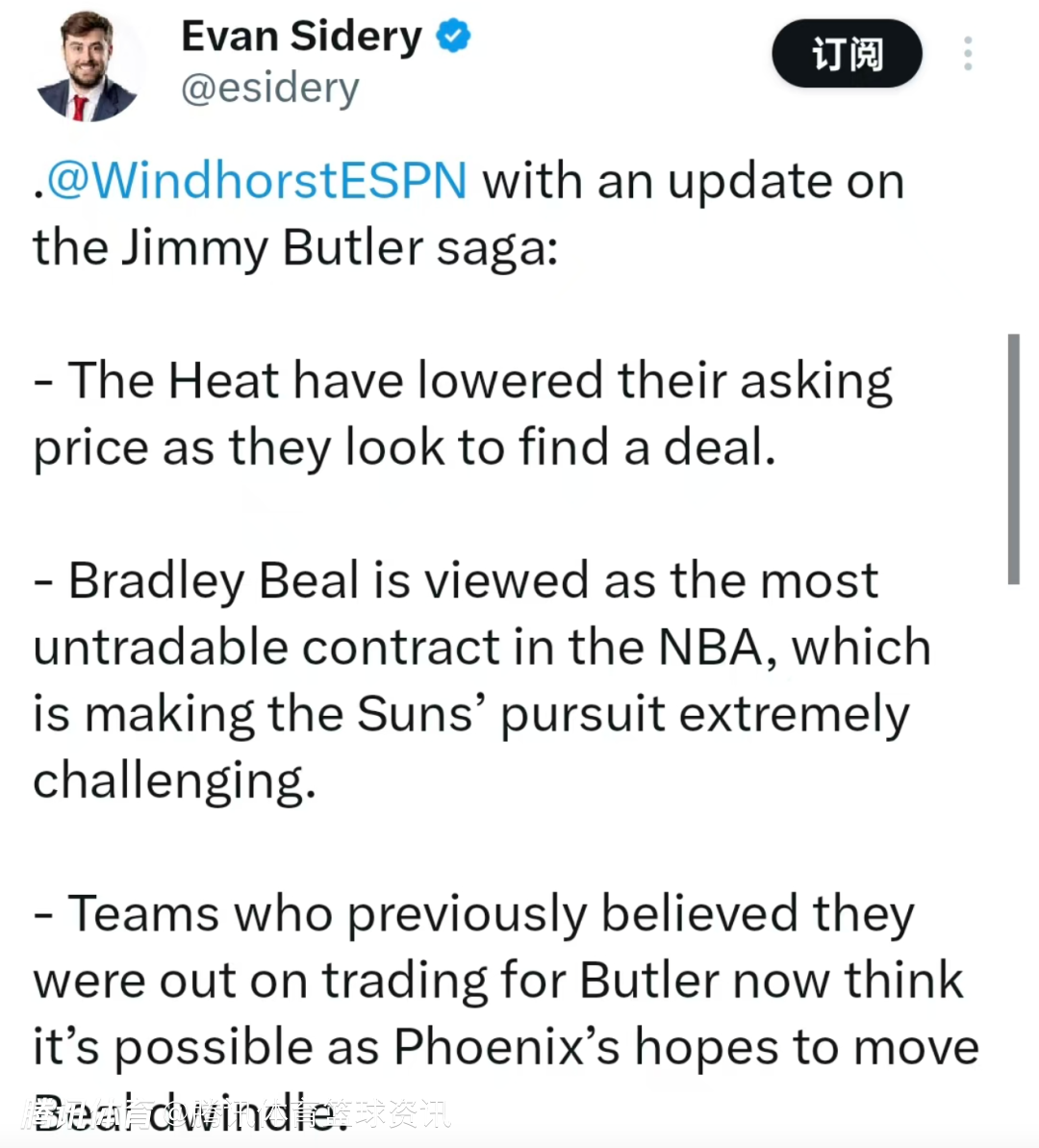 热火对巴特勒要价已降低但太阳或出局 其他球队有望参与其中达成交易