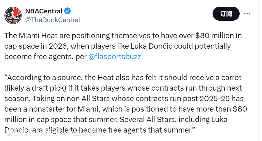 “据一位消息人士透露,热火队还认为,如果他们拿下合同在下赛季到期的球员,就应该得到一个胡萝卜(很可能是一个选秀权)。对于迈阿密热火来说,引进合同超过2025-26赛季到期的非全明星球员一直是个不切实际的想法,因为他们想在2026年夏天将拥有超过8000万美元的顶薪空间,包括卢卡-东契奇在内的几位全明星球员都有资格在那个夏天成为自由球员。”该媒体如此表示。