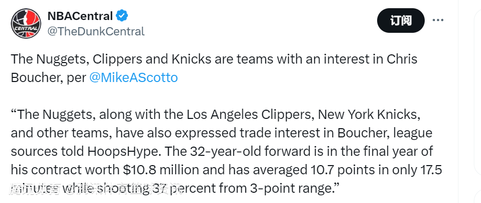 2025-01-29 07:30北京时间1月29日,根据NBA记者Mike Scotto报道,掘金队、快船队和尼克斯队都对克里斯-布切尔感兴趣。