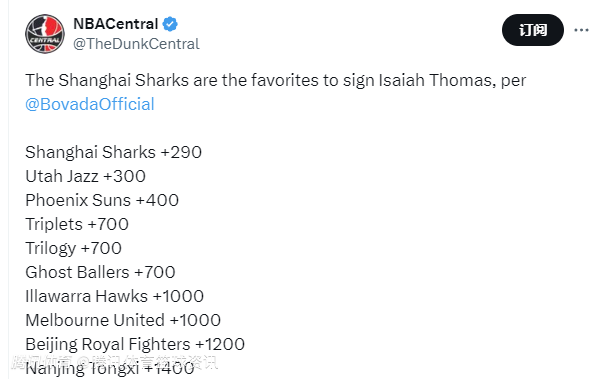 小托马斯加盟上海男篮的赔率为+290(下注100美元,中奖可得290美元),还要超过爵士队(+300)和太阳队(+400),而北控男篮的赔率为+1200,南京同曦的赔率为+1400,排在这份榜单的最后两位。