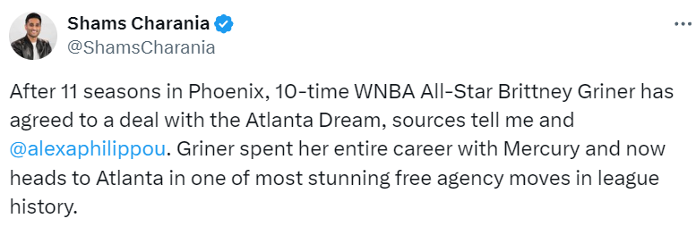 Shams在个人推特上写道:“消息人士告知,在菲尼克斯效力11个赛季后,10届WNBA全明星布兰妮-格里纳已与亚特兰大梦想队达成协议。格里纳的整个职业生涯都在水星队度过,现在她将前往亚特兰大,这是联盟历史上最令人震惊的自由球员转会之一。”