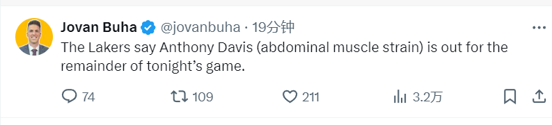 湖人官宣:浓眉腹部肌肉拉伤 本场比赛无法回归