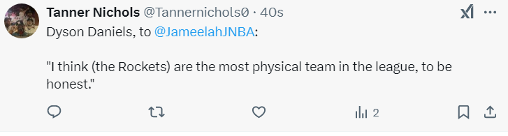 在输给火箭队后,老鹰队后卫戴森-丹尼尔斯这样评价火箭:我认为休斯顿火箭队的身体素质是全联盟中最强的。