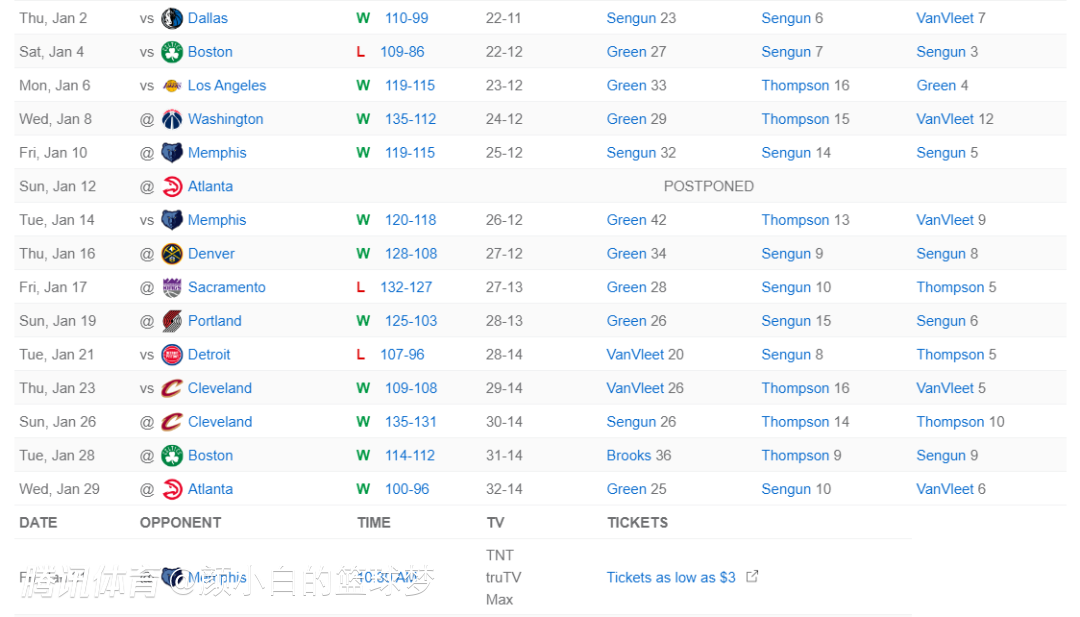 火箭队一月份是魔鬼赛程,可他们在不知不觉中成为了真的魔鬼,两胜骑士,两胜灰熊,复仇绿凯,击败湖人,大胜掘金,火箭这32胜14负已经是联盟第三的战绩仅次于雷霆、骑士,就连东部第二的绿凯都是32胜15负。
