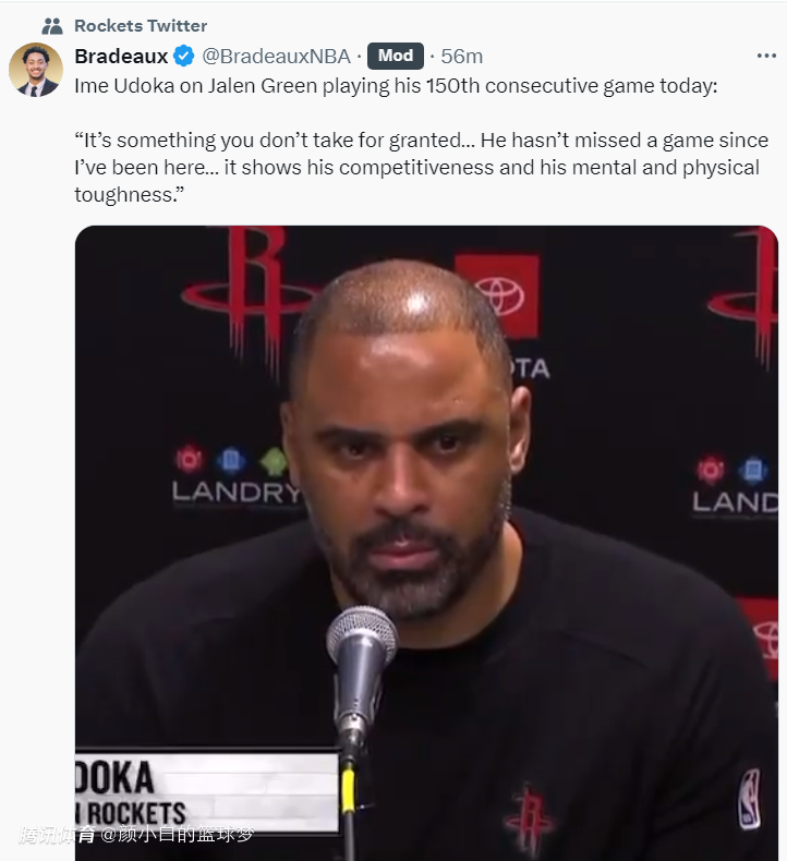 虽然杰伦-格林24中11+三分9中1拿到25分可也有7个失误,低效得分手+失误手,但乌度卡赛后依旧盛赞了格林的职业水准与硬度:“自从我来这里他没有错过任何一场比赛,这显示了他的竞争力与身体的硬度、精神上的强度。”