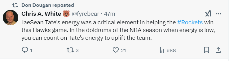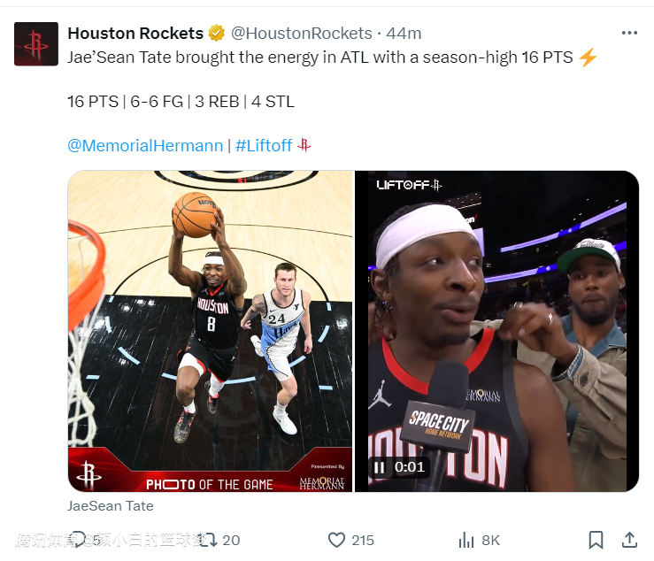 火箭队记克里斯-怀特写道:泰特的能量是火箭击败老鹰的关键,当全队低迷的时候,泰特的能量帮助火箭重新提升。