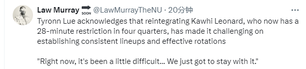泰伦-卢表示:“莱昂纳德现在的出场时间限制为28分钟,重新整合他和现有阵容并形成稳定的有效轮换,是一件很有挑战性的事情。现在我们确实遇到了一些困难,但我们必须坚持下去。”