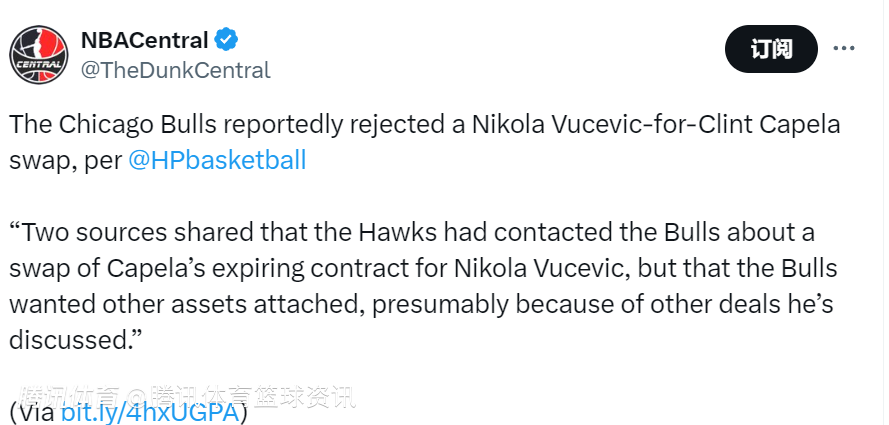 该记者表示:“两位消息人士透露,老鹰队曾与公牛队接触,商讨用卡佩拉的到期合同交换武切维奇,但公牛队希望附加其他资产,可能是因为他们曾讨论过的其他交易。”