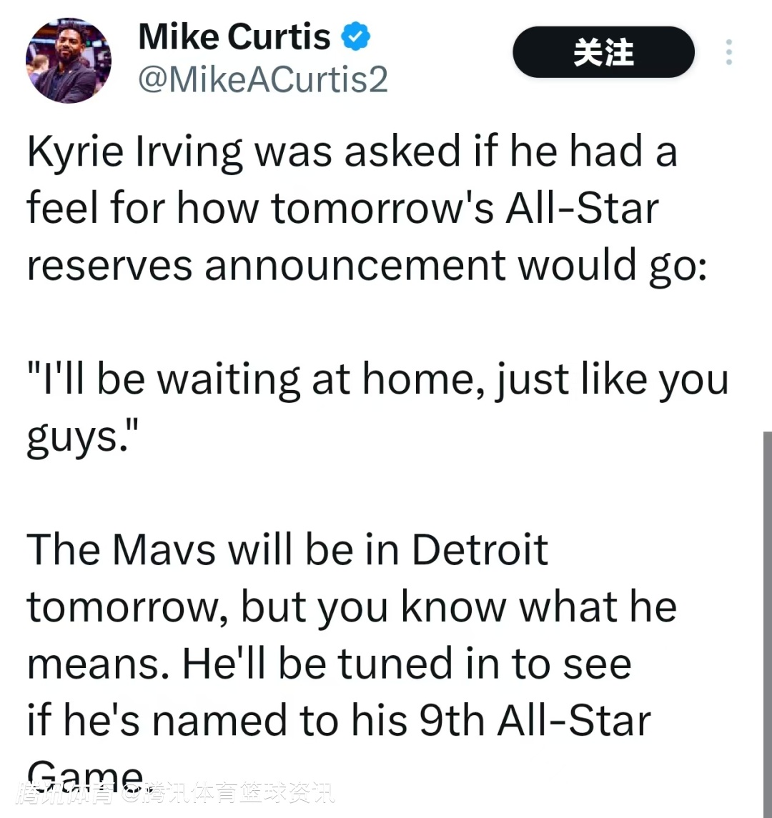 当被问及他是否对明天的全明星替补名单公布有所预感时,欧文说道:“我会在家里等待,就像你们一样。”