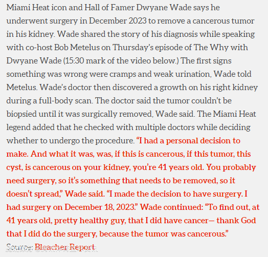 韦德:我在2023年曾接受手术切除右肾40% 术后显示肿瘤呈癌性