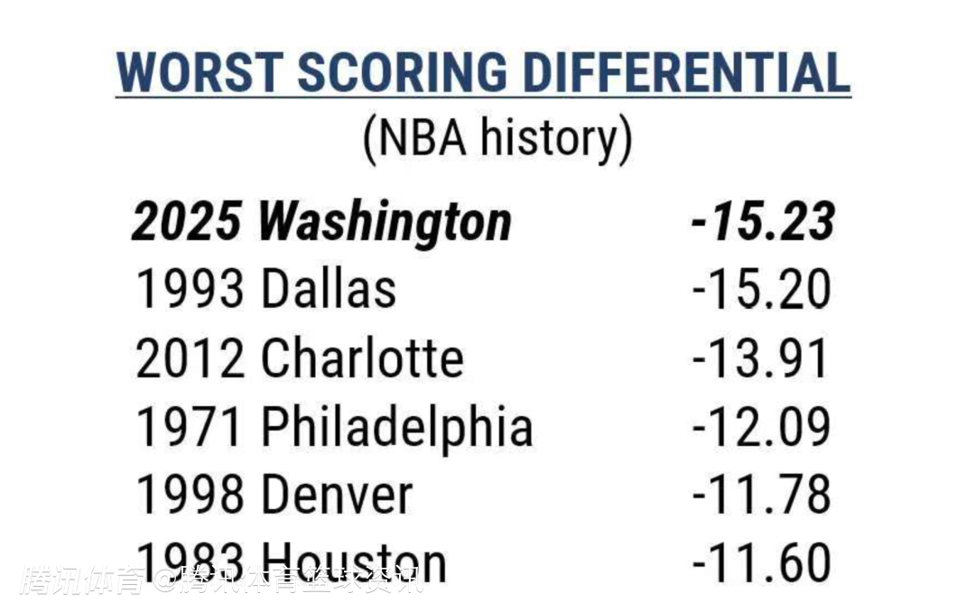 据相关统计显示,本赛季奇才场均失分高达15.23分,为历史最多,高于1993年的独行侠(15.20分)、2012年的夏洛特山猫(13.91分)、1971年的76人(12.09分)、1998年的掘金(11.78分)和1983年的火箭(11.60分)。