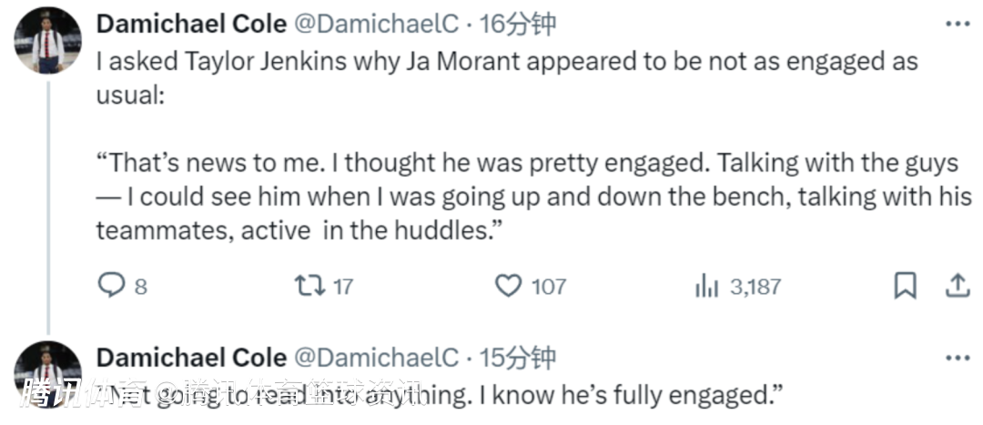 被问及这场比赛在场下观战的莫兰特为什么看起来不像往常那么投入,詹金斯表示:“我认为他非常投入,我在替补席上来回走动的时候,能看到他和队友在交谈,在人群中很活跃。不想去妄加猜测,我知道他是完全投入其中的。”