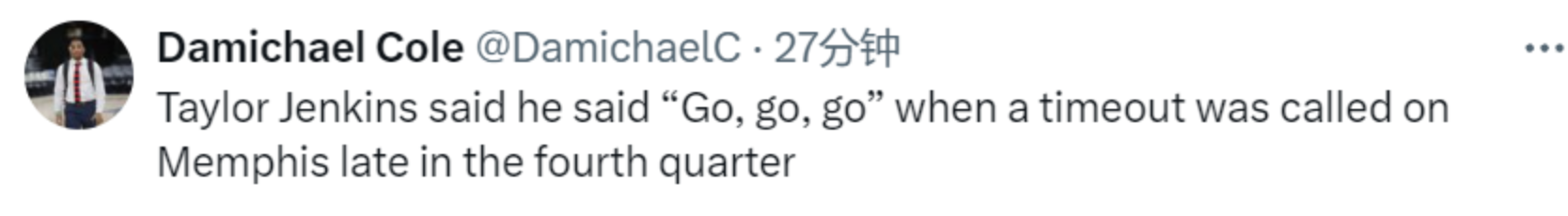 谈及球队最后原本有机会通过快攻扣篮反超比分,但裁判先吹停比赛导致进球无效,詹金斯表示:“我当时喊的是‘go go go’,没喊暂停。”