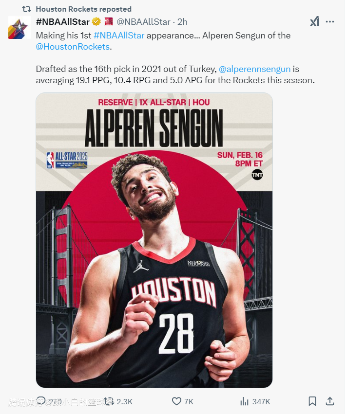 申京入选全明星阵容,他成为2020年威少哈登后首位火箭全明星球员。