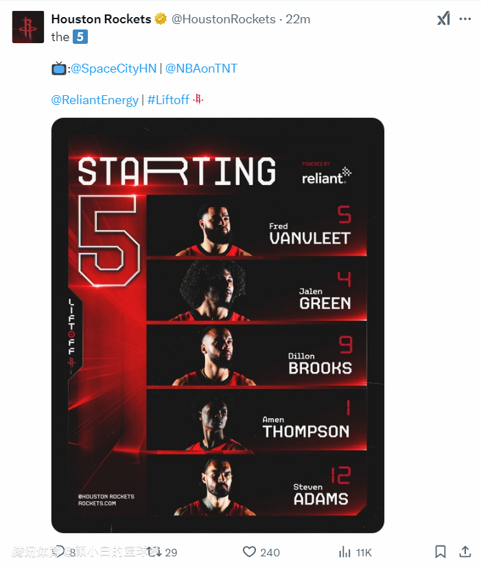 火箭:范弗利特、格林、狄龙、阿门、亚当斯;