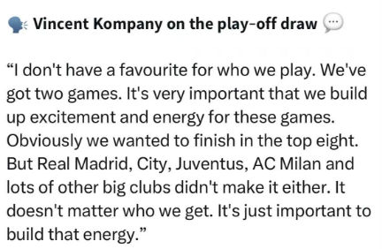 在谈到欧冠淘汰赛附加赛的抽签时,孔帕尼表示:“我没有特别的偏好。在淘汰赛附加赛之前,我们只有两场比赛,为这些比赛积蓄能量才是关键。我们当然希望进入前8名,但皇马、曼城、尤文、米兰等大俱乐部都不在前8名。无论对手是谁,我们都要做好准备,积蓄能量。”