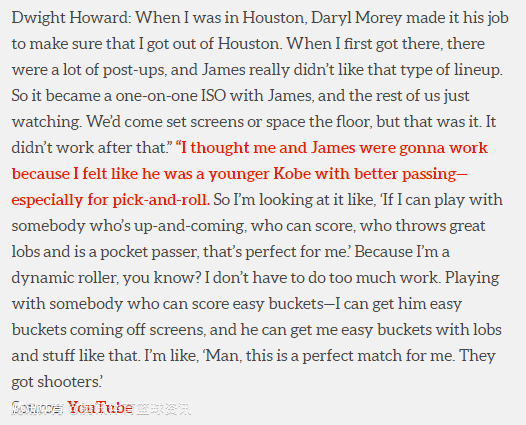 “我原以为我和哈登会很合拍,因为我觉得他像是一个传球更好的年轻版科比,特别是在挡拆配合上。所以我当时想,‘如果我能和一个正在崛起、能得分、能传漂亮空接球、还能精准传球的球员一起打球,那对我来说简直太完美了。’因为我是那种很有活力的挡拆顺下型球员,不需要做太多工作。和一个能轻松得分的球员一起打球,我可以通过掩护给他创造轻松得分的机会,他也可以通过空接等配合给我创造轻松得分的机会。我当时觉得这对我来说简直是绝配,而且火箭队还有射手在阵。”