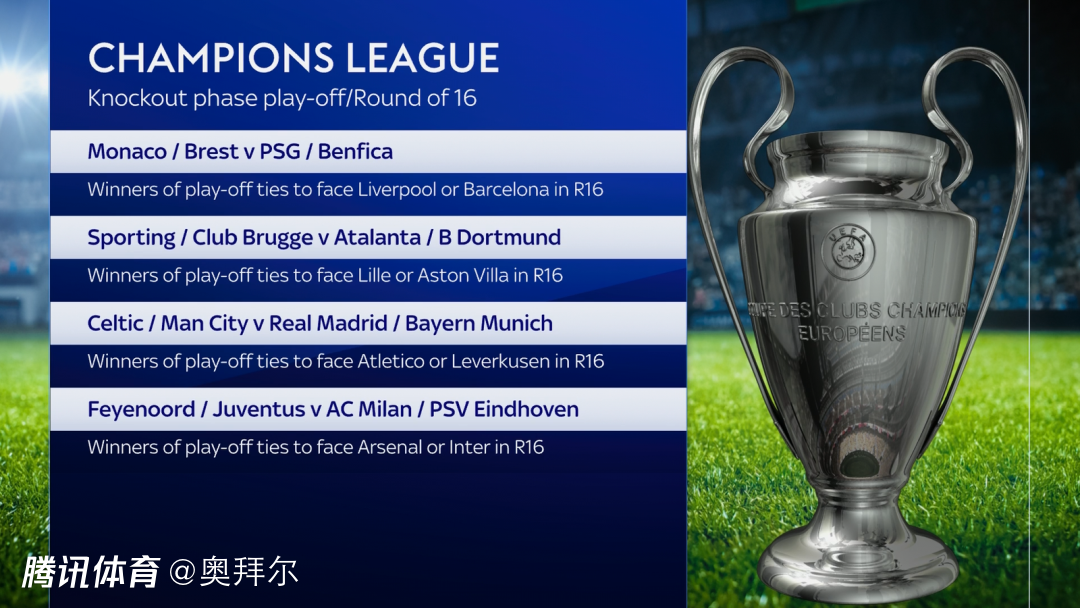 在欧冠联赛阶段,亚特兰大、多特蒙德、皇马、拜仁、AC米兰、埃因霍温、巴黎圣日耳曼、本菲卡排名第9到第16位,摩纳哥、布雷斯特、费耶诺德、尤文、凯尔特人、曼城、葡萄牙体育、布鲁日排名第17到第24位。按照规则,凯尔特人、曼城将分别对阵皇马、拜仁。