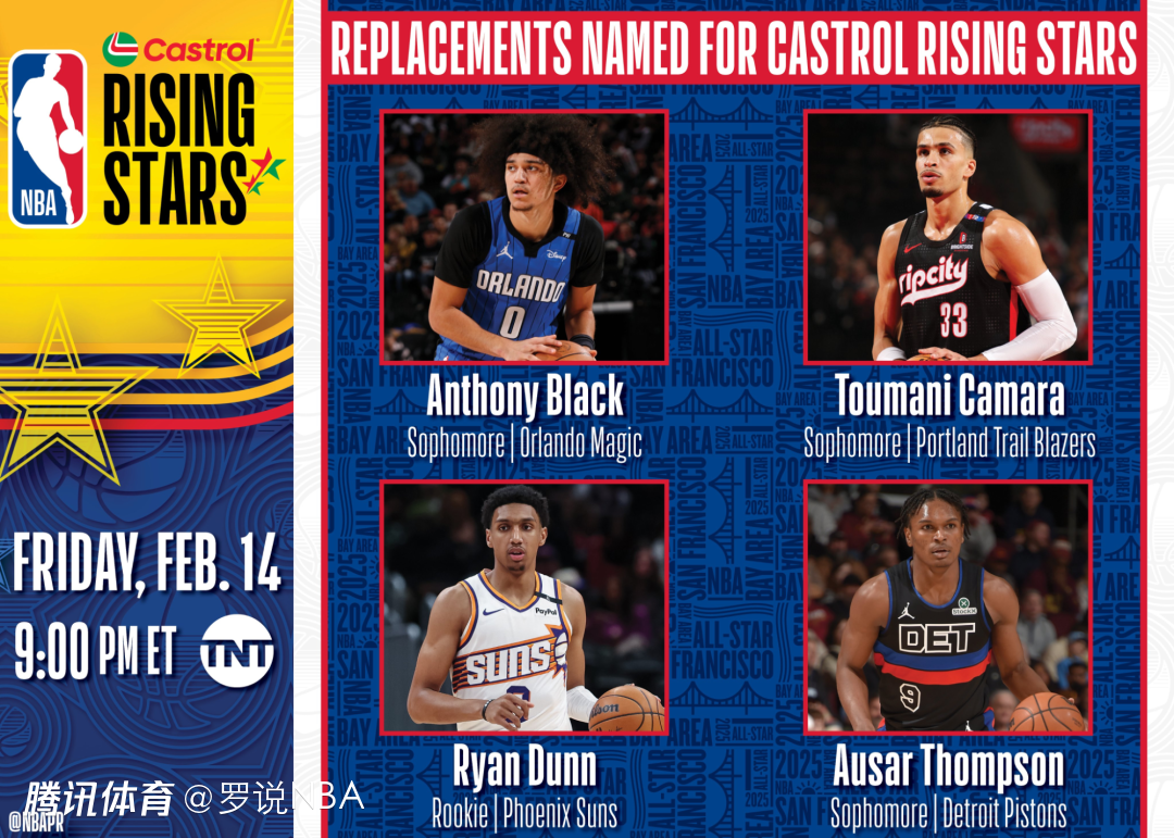 官方表示,邓恩将取代76人队新秀麦凯恩,后者于12月18日接受了手术,修复左膝外侧半月板撕裂,赛季报销。布莱克、卡马拉和奥萨尔-汤普森将取代独行侠的莱夫利、黄蜂的布兰登-米勒和马刺的文班亚马。