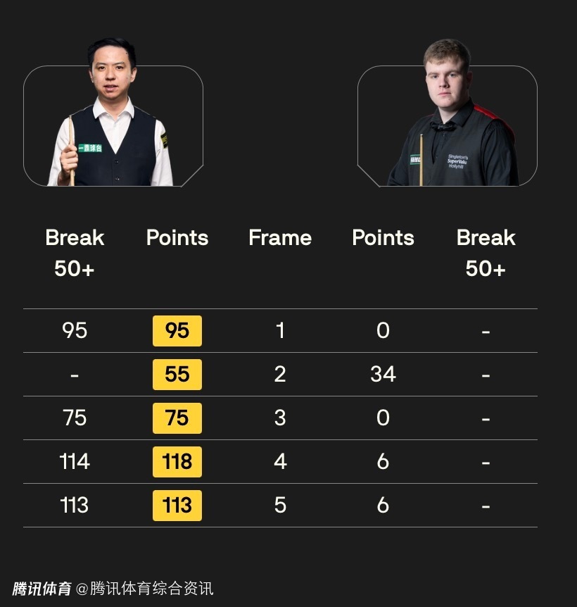 在这场比赛中,亚伦-希尔未能给肖国栋制造太多压力。首局比赛,肖国栋迅速进入状态,凭借单杆95分的出色表现拿下首局,取得1-0的领先。第二局,肖国栋多次上手,拿到55分,以55-34再下一城,将比分改写为2-0。第三局,肖国栋再次打出单杆75分,以3-0领先。第四局,肖国栋更是凭借单杆114分的绝佳表现,以118-6拿下此局,4-0领先拿到赛点。第五局,肖国栋延续火热手感,打出单杆113分,以113-6锁定胜局,最终以5-0横扫亚伦-希尔,成功闯入半决赛。