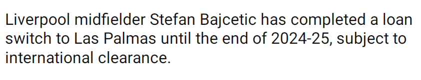2025-02-01 07:10北京时间2月1日,根据利物浦官方发布的消息显示,球队中场球员巴伊切蒂奇将租借加盟拉斯帕尔马斯。此前,巴伊切蒂奇在2024年夏天从利物浦租借至萨尔茨堡红牛,原计划租借期将持续到本赛季结束。然而,他将提前终止与萨尔茨堡红牛的租借合同,转而为拉斯帕尔马斯效力。